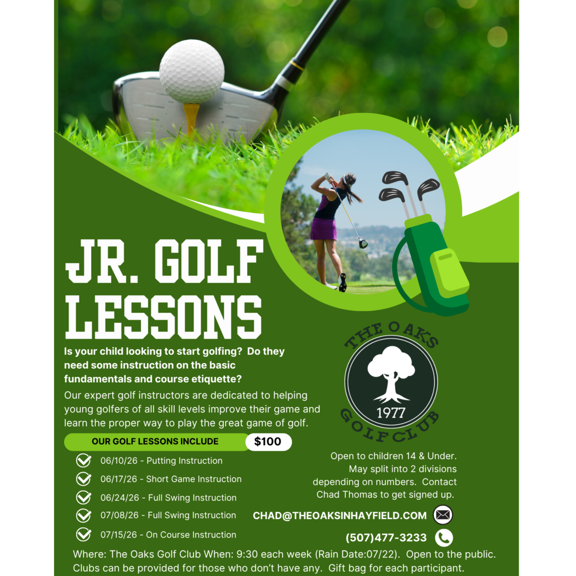 Use our event space to host your next get-together. The Oaks Golf Club has something for everybody. Call 507-477-3233 today to book a tee time or speak with a professional about lesson packages.